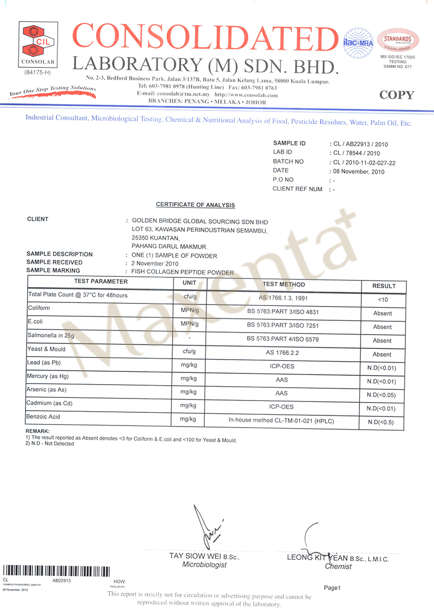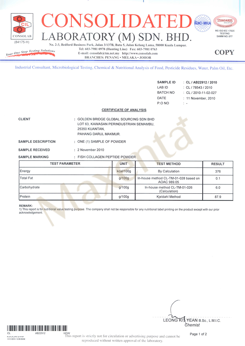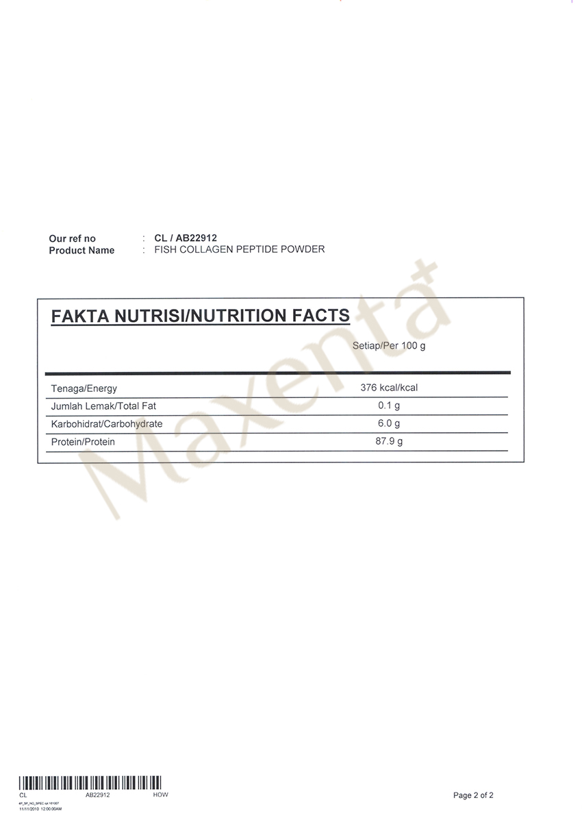 Fish Skin Collagen Peptide (5000mg) MAXENTA Fish Collagen Peptide produce by wild caught Alaska Pollock Skin. The fish Skin Collagen Peptide has a similar molecular structure to human collagen, and its 1800 Dalton molecular size (Nano Grade) can be absorbed more effectively by the body. It can repair the dermis, enhance the absorption of nutrients and water, improve dry skin; the cells become perfect, and thus improve dry skin; the cells become perfect, and thus improve the skin problems such as sagging skin, wrinkles and enlarged pores.